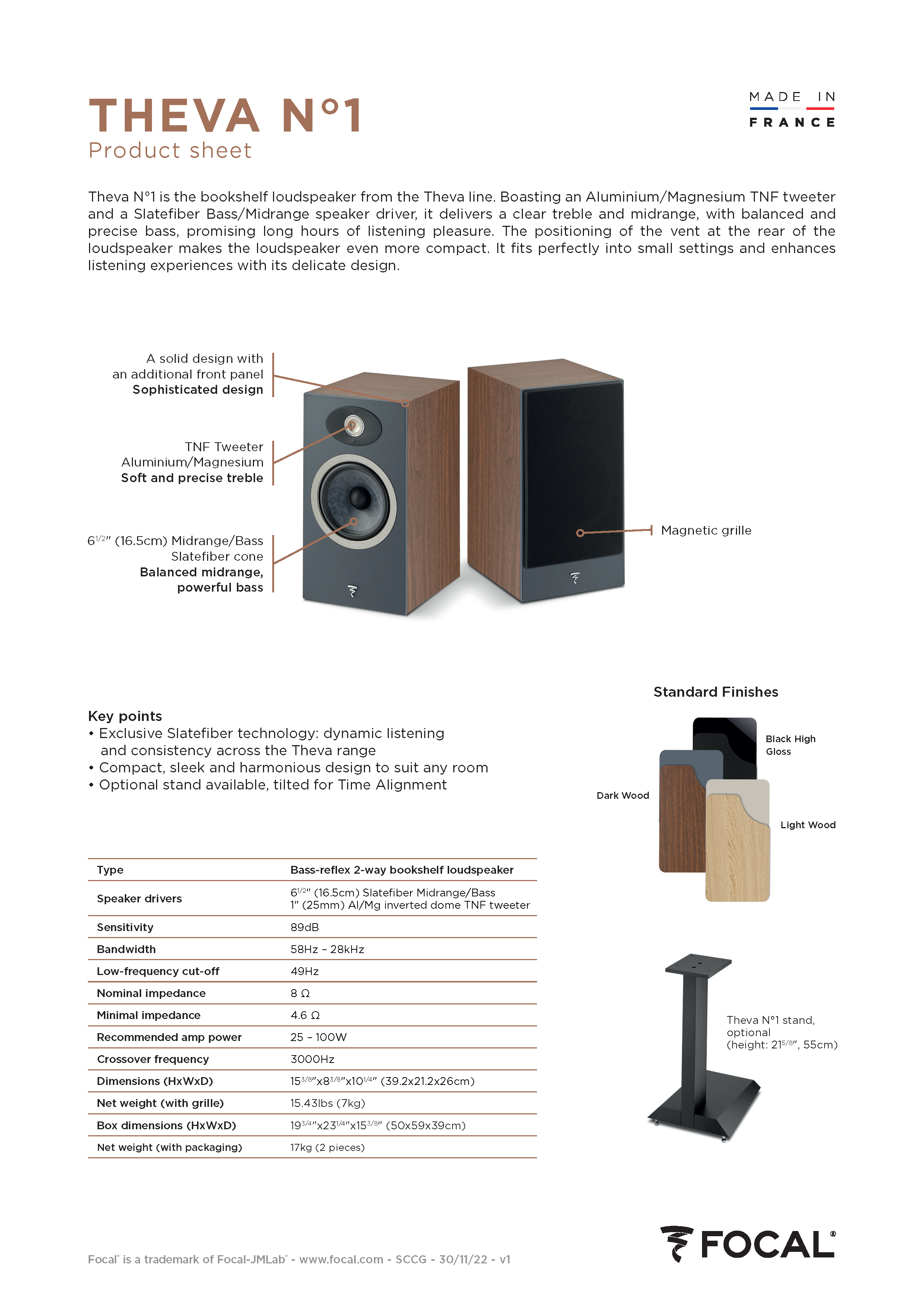 由於 TNF 高音單元和 Slatefiber 振膜驅動器這兩項 Focal 獨有的技術,Theva N°1 可提供水晶般清晰的高音和精確、平衡的中音/低音,帶來高保真音質。