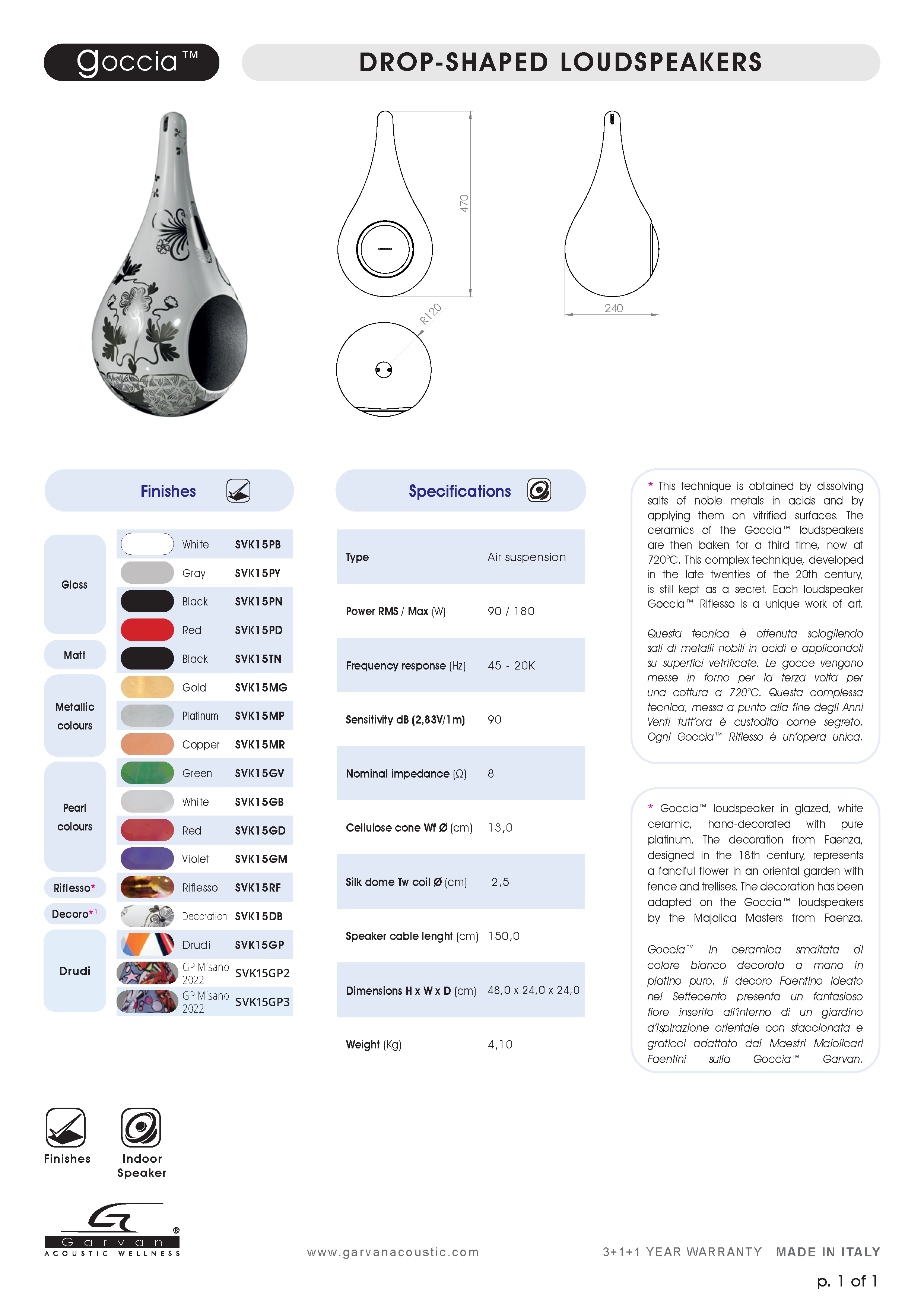 Goccia 是唯一結合自然聲音擴散、設計與藝術的懸吊式喇叭。不僅是音響設備,更是一件裝飾藝術家具,採用 Faenza 陶瓷製作,設計典雅而永恆,透過尖端技術將其懸浮於地面之上。