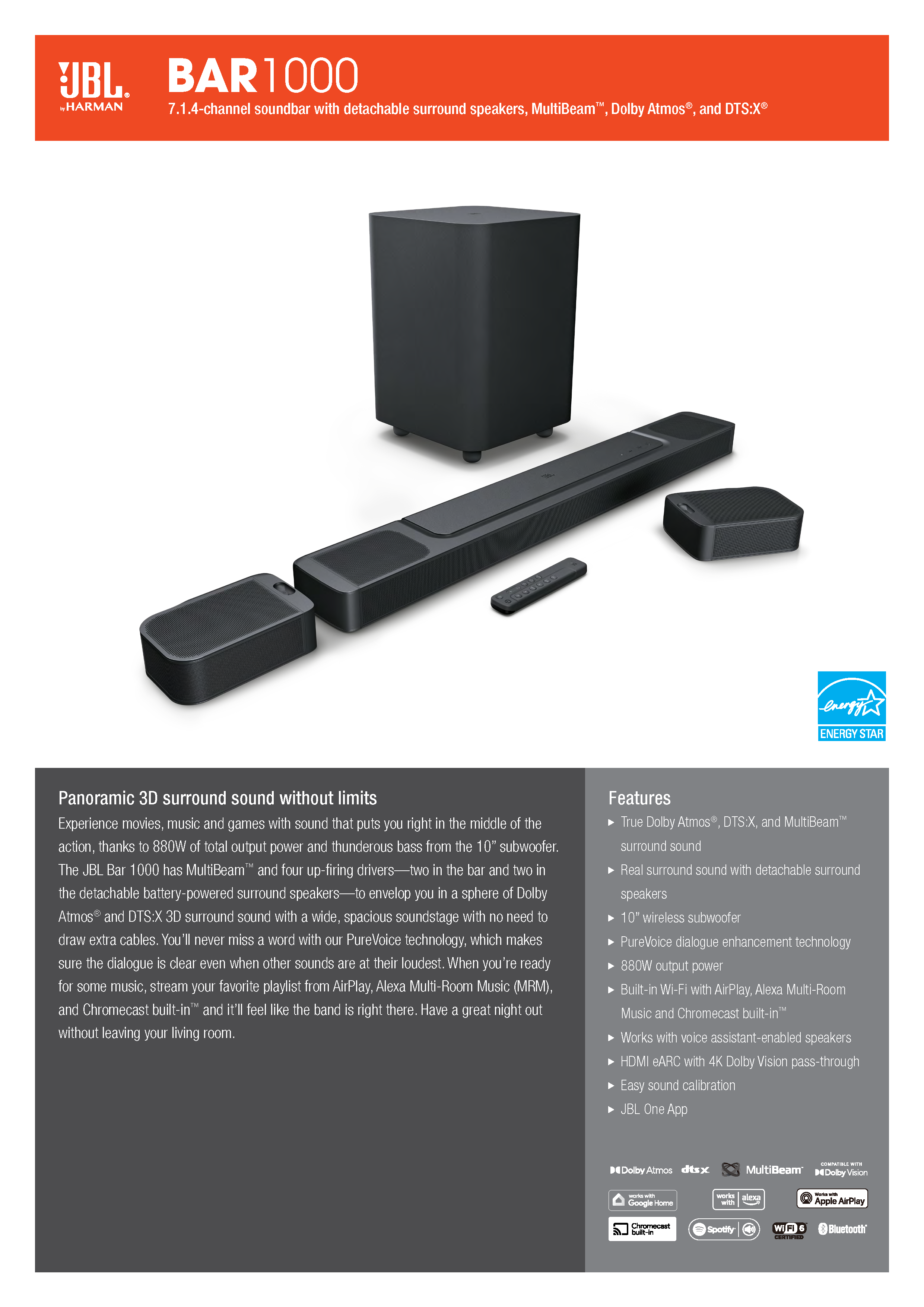 7.1.4 聲道 Soundbar,附可拆卸環繞喇叭、MultiBeam™、Dolby Atmos® 和 DTS:X®