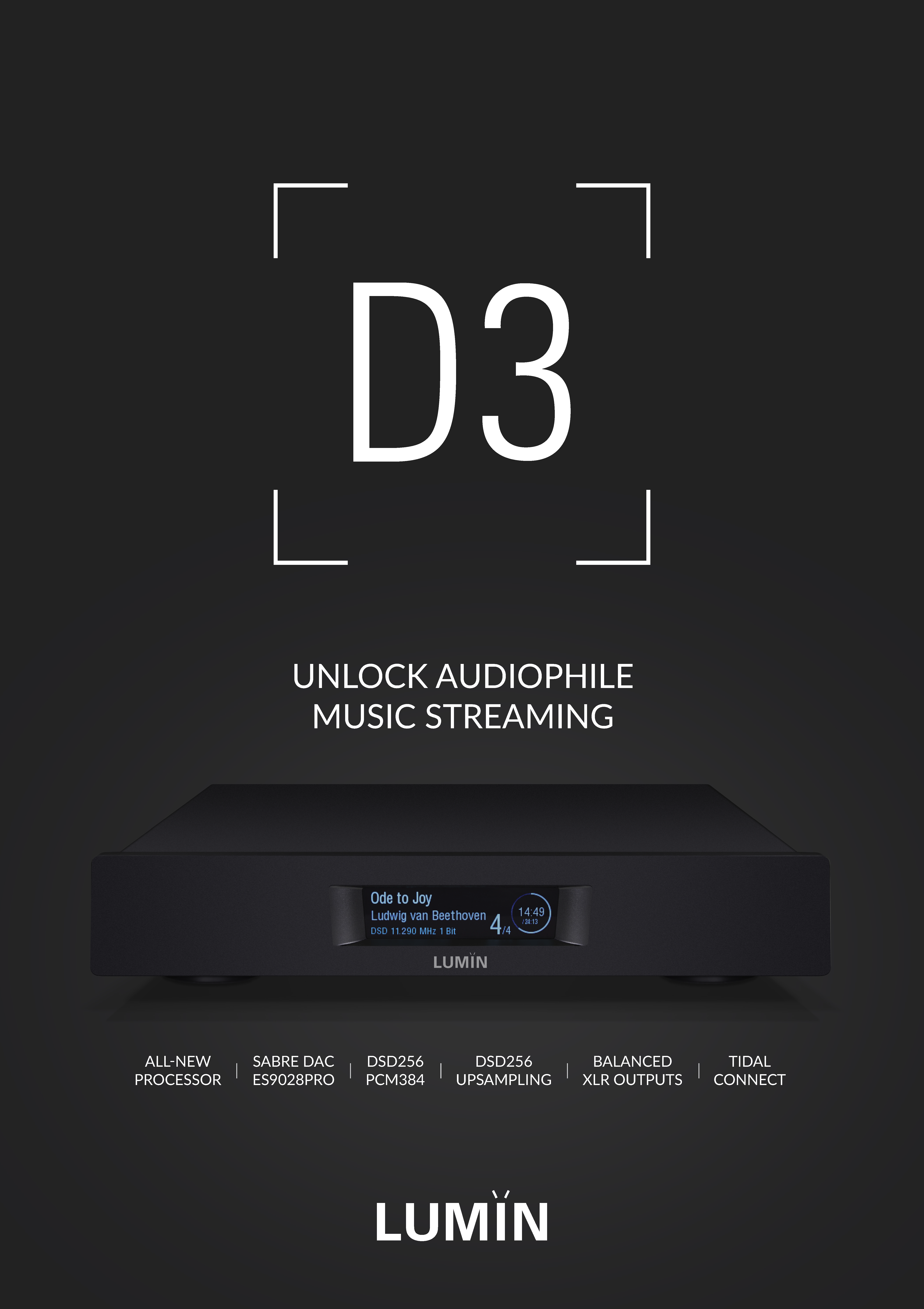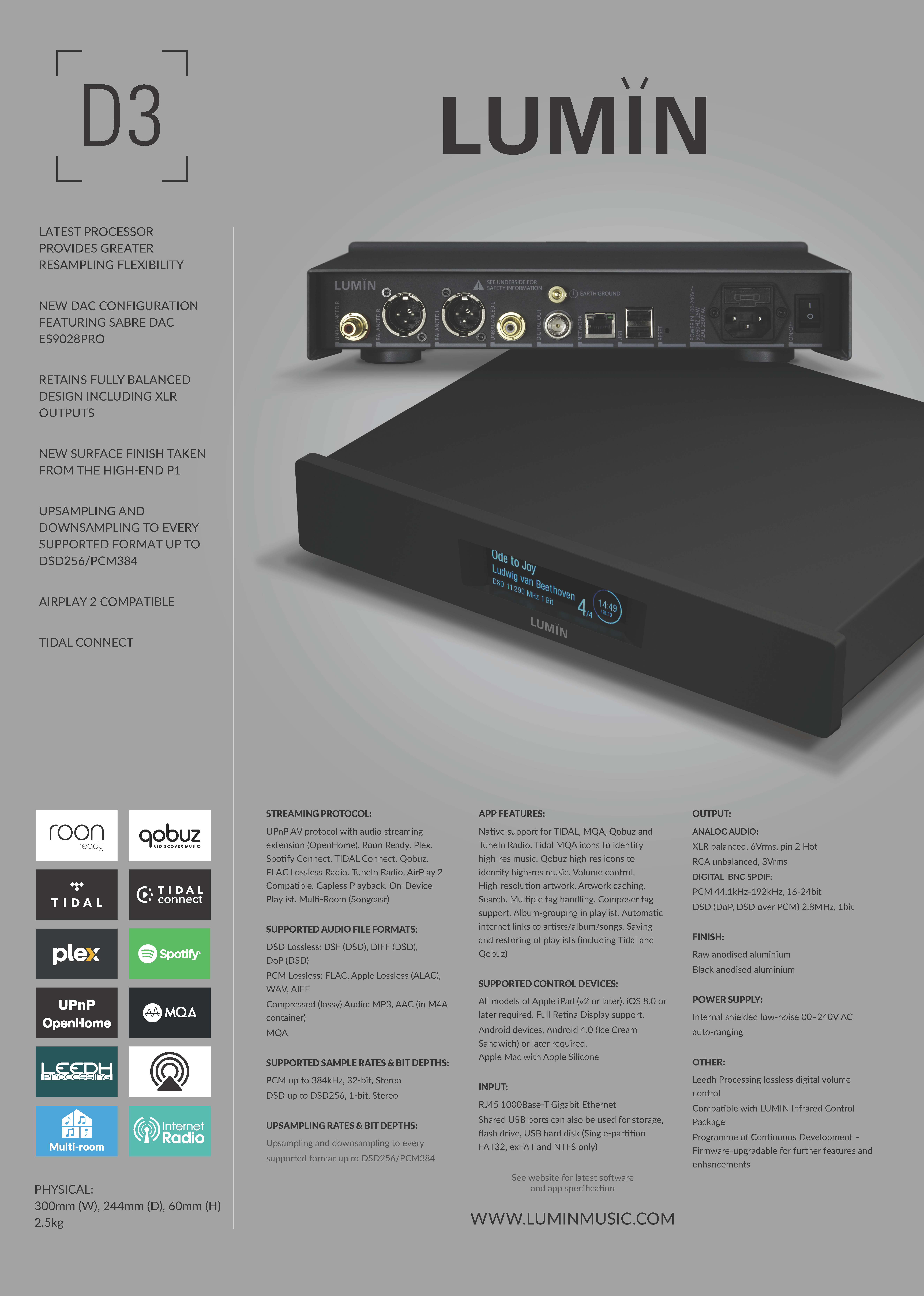 Lumin D3身兼網路串流、數位類比解碼與Leedh Processing數位音控,採用最新運算晶片架構搭配ES9028PRO解碼晶片,最高支援DSD256與PCM384音樂格式,提供完整升降頻運算選擇,類比具單端RCA與平衡XLR輸出,支援Tidal Connect、Roon Ready、Airplay2、Spotify Connect、MQA、TIDAL、Qobuz、Plex、TuneIn。Lumin D3使用全鋁箱體製作,提供最佳屏蔽