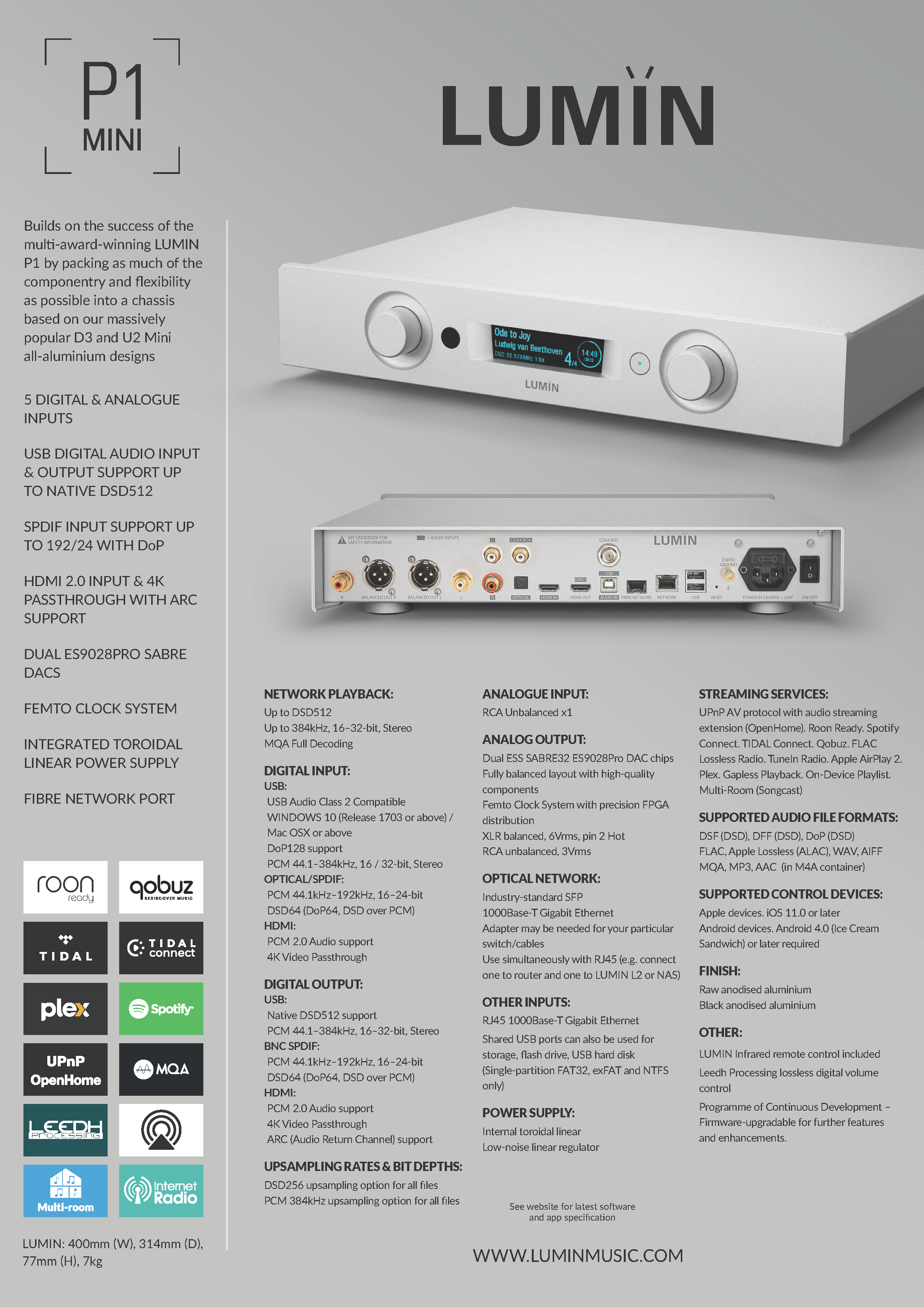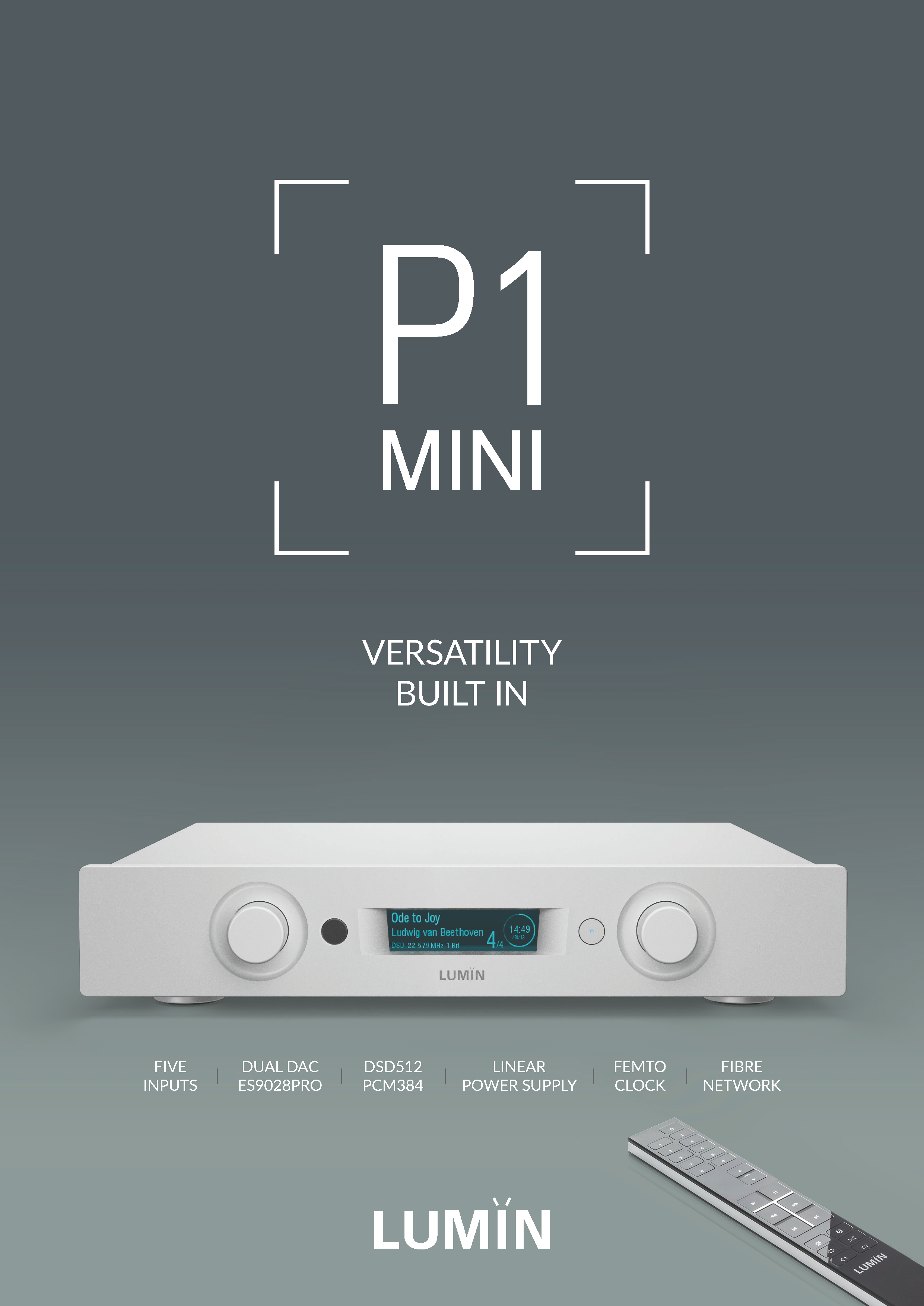 LUMIN P1 Mini can be used like all other LUMIN players. With its DSD512/PCM384 support, Femto Clock System, Fibre Networking, toroidal power supply, and Leedh Processing, it's packed with incredible components.