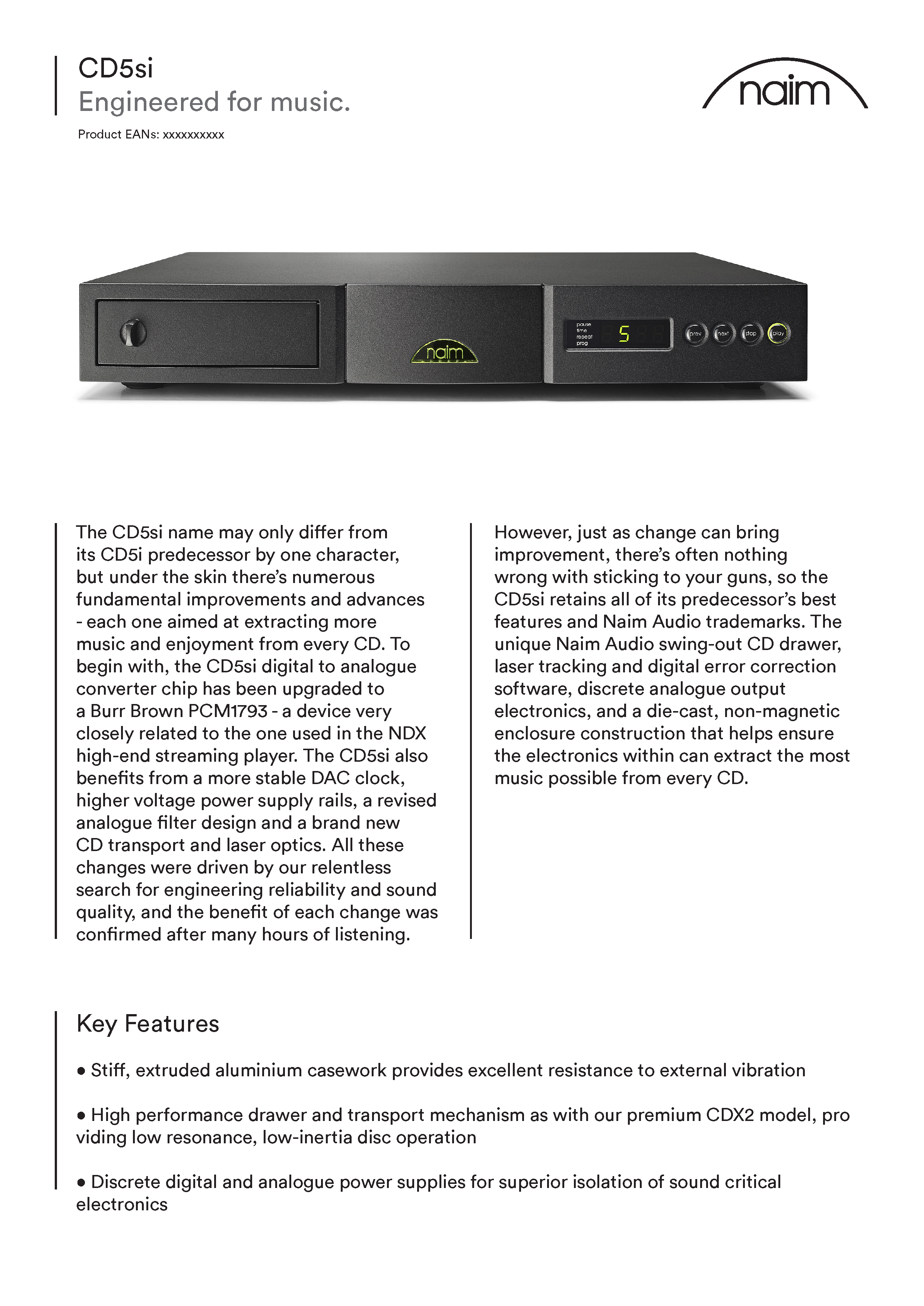 CD5si CD 播放機為音樂表現樹立了全新標準,特別是在與 NAIT 5si 綜合擴音機搭配時,更能發揮卓越音質。雖然數位串流已成趨勢,但 CD 依然是備受喜愛的音樂格式,Naim Audio 深知這一點。對於全球數百萬音樂愛好者來說,CD 仍然是音樂收藏的核心與靈魂。