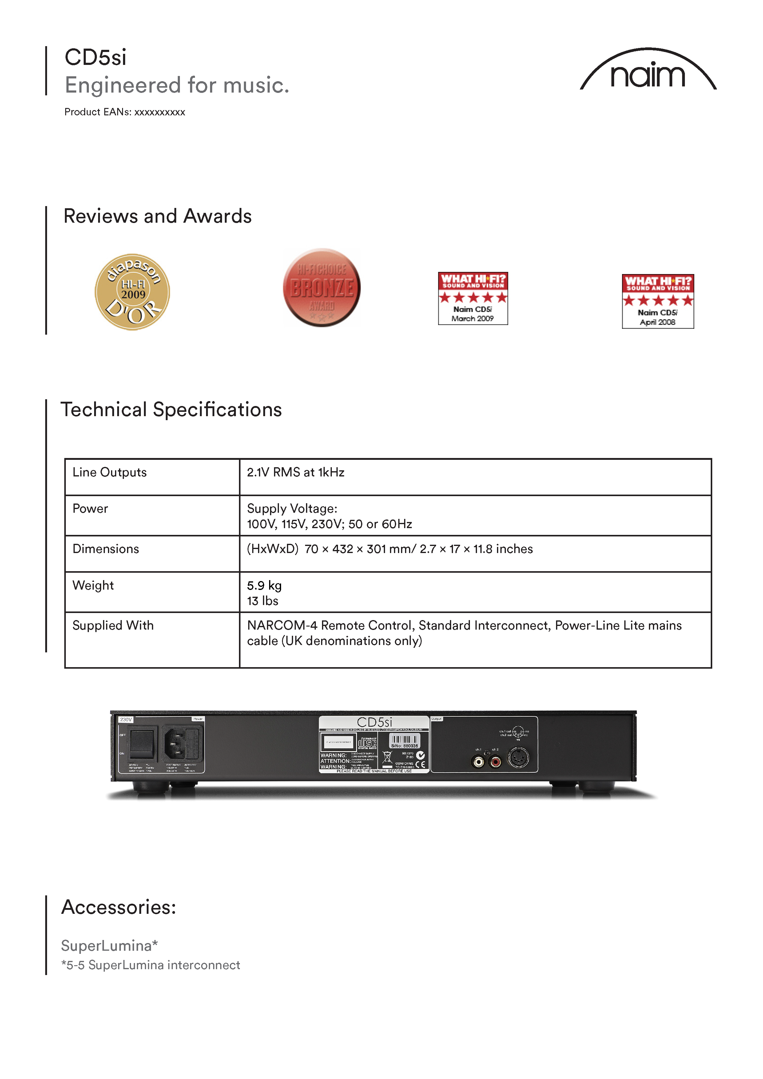 CD5si 採用高剛性的擠壓鋁製機身,能有效抵抗外部振動影響。其高性能的 CD 抽屜與傳輸機構,與高階 CDX2 型號相似,確保低共振、低慣性的光碟運行。此外,CD5si 配備獨立的數位與類比電源供應,以確保音質關鍵電路獲得最佳隔離,進一步提升聲音表現。