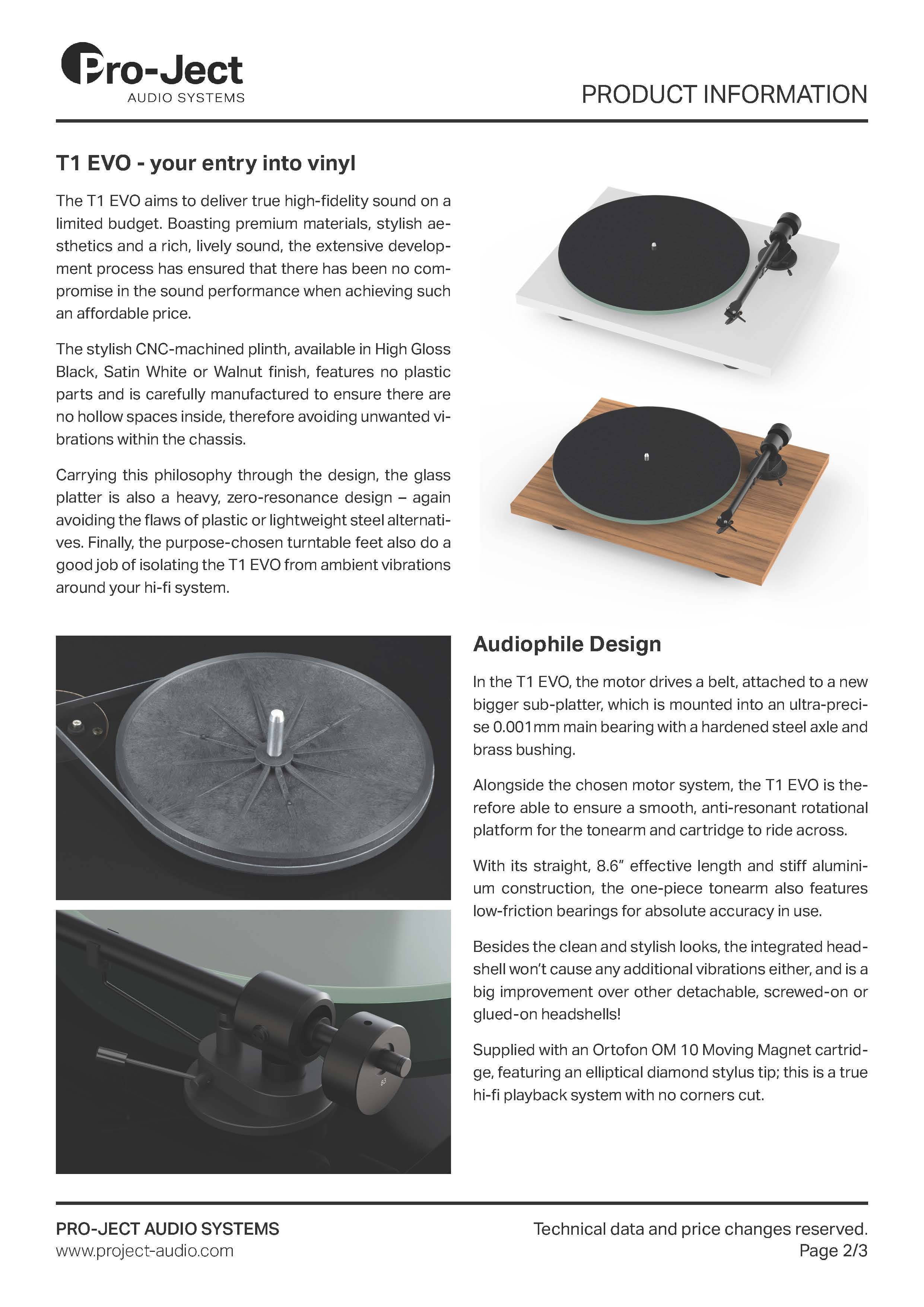 在 T1 EVO Phono 中,馬達驅動一條皮帶,皮帶連接到一個新的更大的副轉盤上,該副轉盤安裝在一個超精密的 0.001 毫米主軸承上,主軸承帶有硬化鋼軸和黃銅襯套。