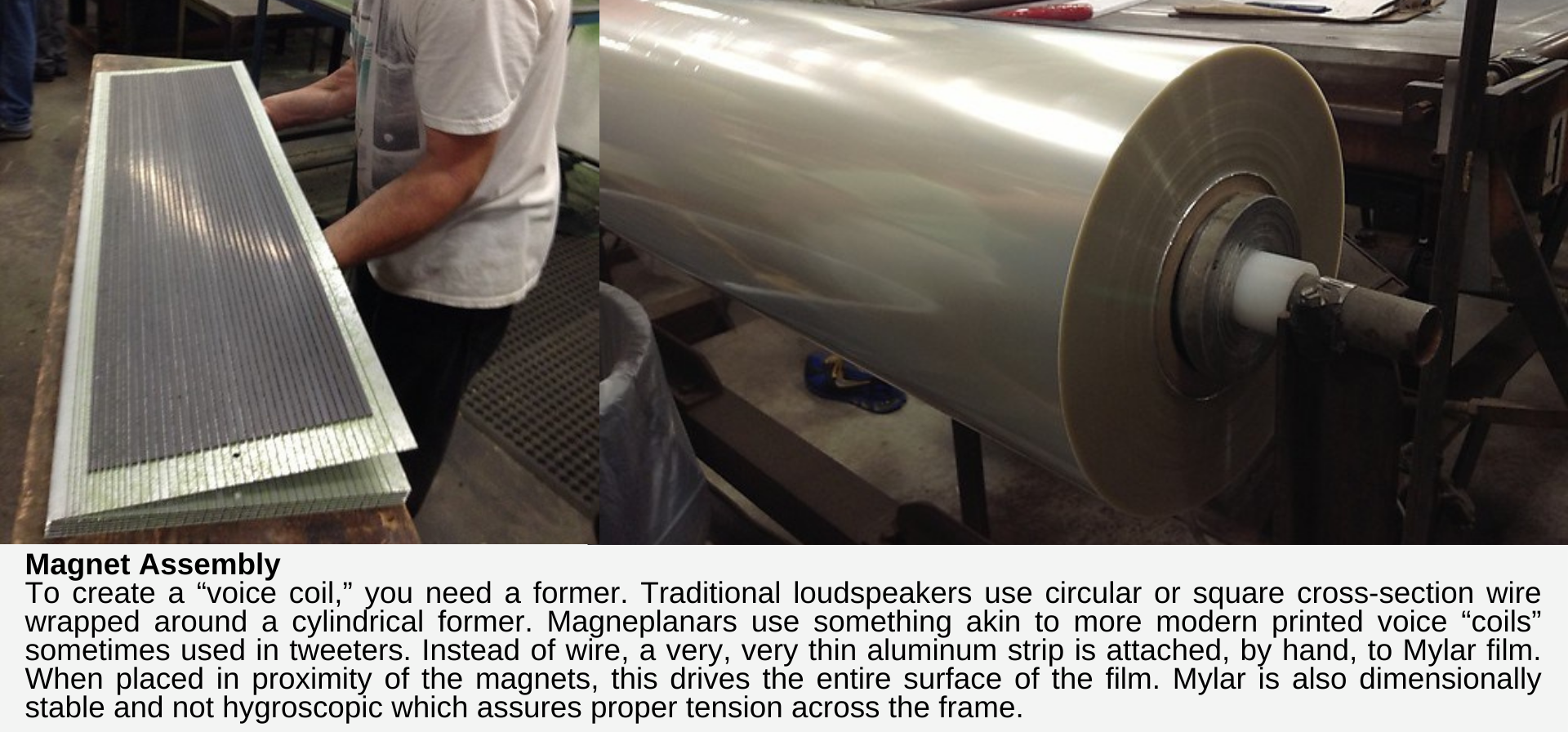 Magnepan has been manufacturing innovative, world class stereo speakers for 47 years. Jim Winey, the inventor of the Magneplanar loudspeaker, first owned electrostatic loudspeakers and began experimenting to design an improved electrostatic speaker. In 1969, Jim invented the Magneplanar, a thin-film magnetic equivalent to the electrostat and founded Magnepan. Corporate and manufacturing facilities are located in White Bear Lake, Minnesota, a small community north of the Twin Cities of St. Paul and Minneapolis. Having outgrown its original facilities, Magnepan’s current plant is over 50,000 square feet in addition to corporate and engineering offices. To date, over 200,000 pairs of Magneplanar loudspeakers have found their way into the homes of music lovers the world over. Magneplanars are American-made with virtually all American parts. And we are proud to say— “Made in America. Sold in China.”