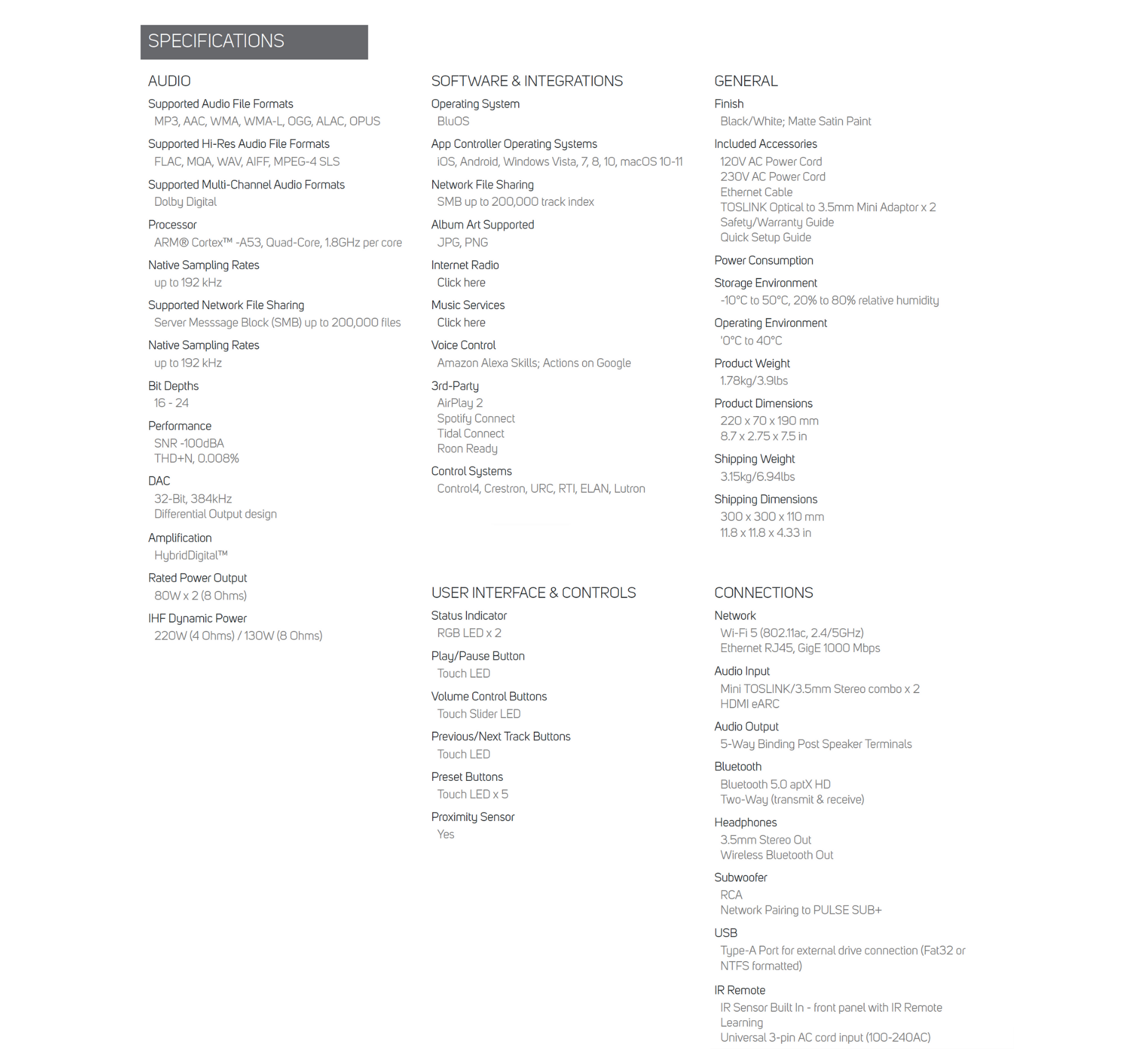 - Hi-res audio streaming with access to Internet radio stations, cloud music services, and your own local music library to multiple Bluesound Players.