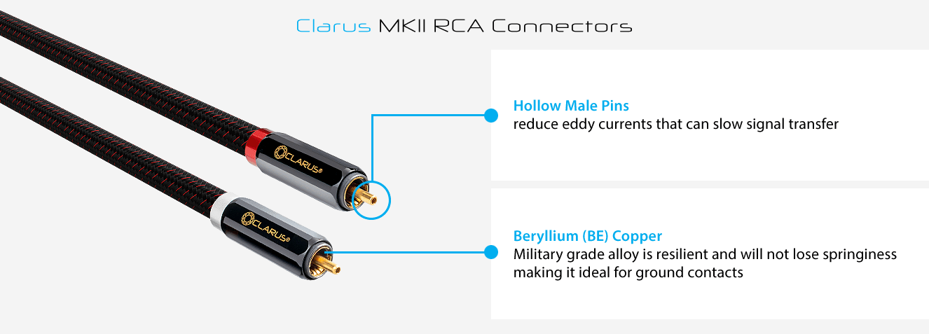 Clarus terminates MKII subwoofer cables with RCA connectors made from two copper alloys: high-purity, high-conductivity tellurium copper provides low resistance with superior sound characteristics, and lightweight, springy, and high-conductivity beryllium copper guarantees solid contact and low-loss signal transfer.