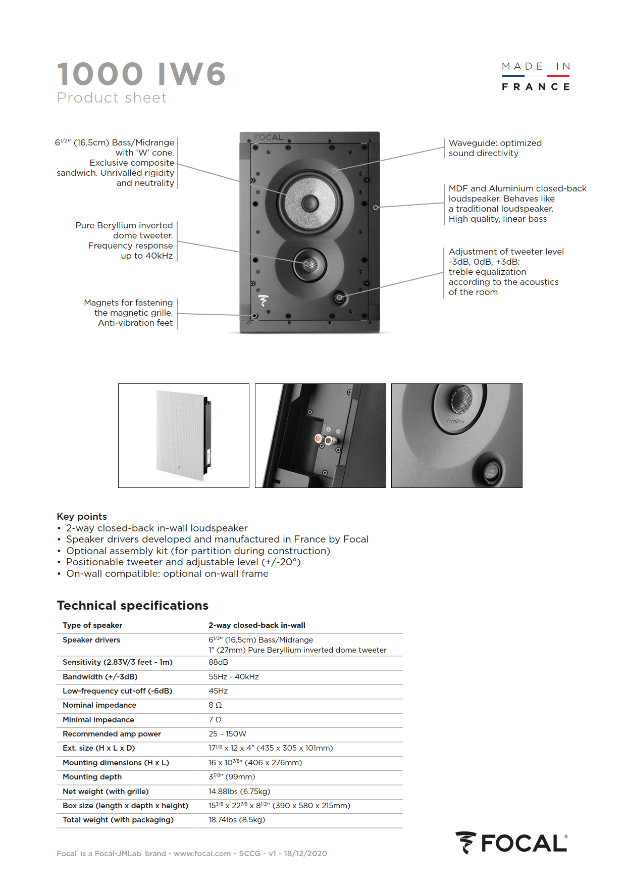 The 1000 IW6 closed-back loudspeaker offers a truly compact and invisible alternative to a traditional indoor acoustic installation. Thanks to its high-quality sound performance, it is the obvious choice for a Home Cinema system, particularly as a rear channel in-wall integration. Offering cutting-edge acoustic technologies exclusive to Focal, such as the Beryllium tweeter and ‘W’ cone, this made in France loudspeaker offers sound reproduction that combines musicality and power. Thanks to its adjustable feature at the tweeter level, you can ensure your installation is optimised to your listening room.