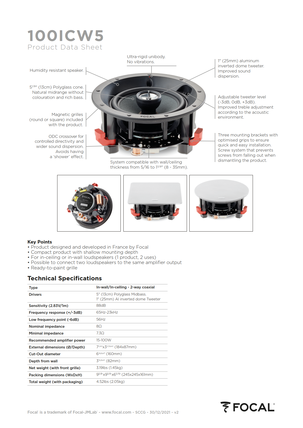 The 100ICW5 loudspeaker which is dedicated to home delivers an amazing sound quality and has a compact design. The product is aimed at small to medium sized rooms and for three types of use: distributed systems (hallways, living rooms…), stereo systems (bedrooms, kitchens…) and Home Cinema systems (in dedicated rooms or living rooms). This product is suitable for every room in the house, even in humid environment such as bathrooms. It can be used in-wall or in-ceiling.