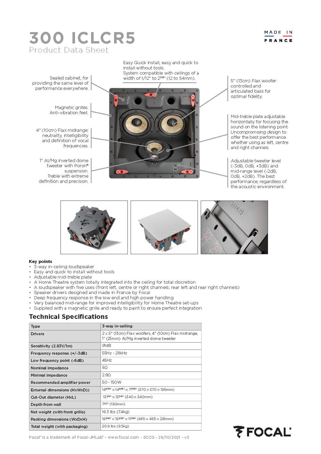 The 300ICLCR5 in-ceiling loudspeakers are made in France and are dedicated a residential use. This LCR (Left, Central, Right) loudspeaker is ideal for building an exceptional Home Cinema set-up, in rooms up to 320ft². This in-ceiling loudspeaker is perfect for very open-plan spaces without any nearby rear wall. Five uses are possible: front left, centre or right channels, rear left and rear right channels.