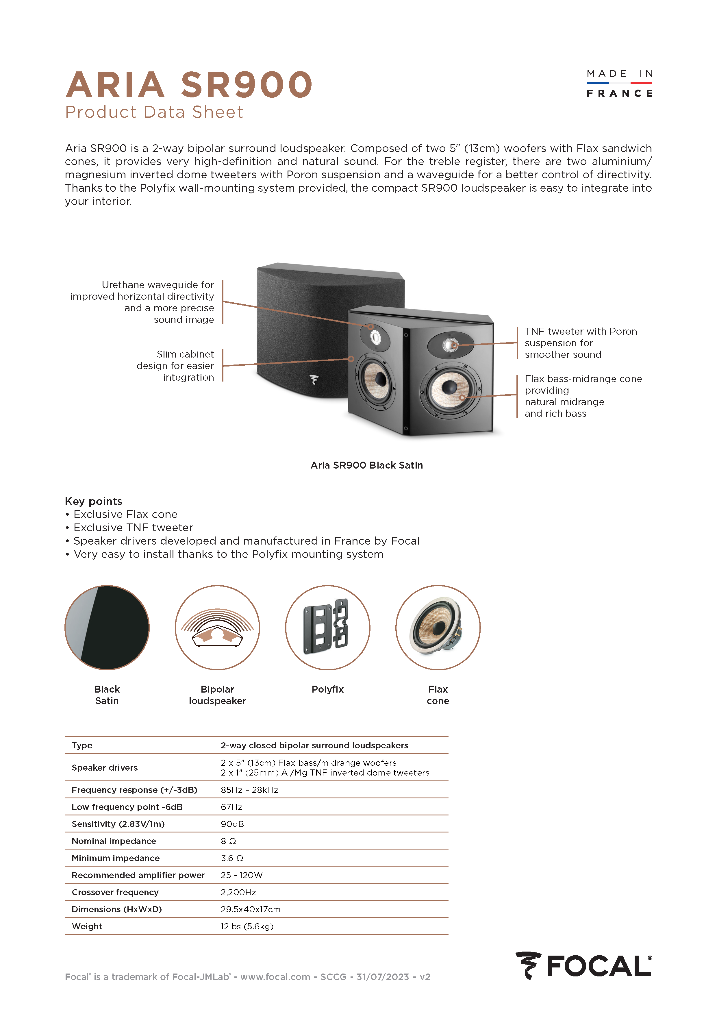 Aria SR 900 is a 2-way bipolar surround speaker featuring all the advantages of the Aria Evo X range, including the famous Flax membrane. Combined with two floor-standing speakers, the Aria Evo X Center and the Sub 1000 F subwoofer, it guarantees an uncompromising 5.1 home theater installation.