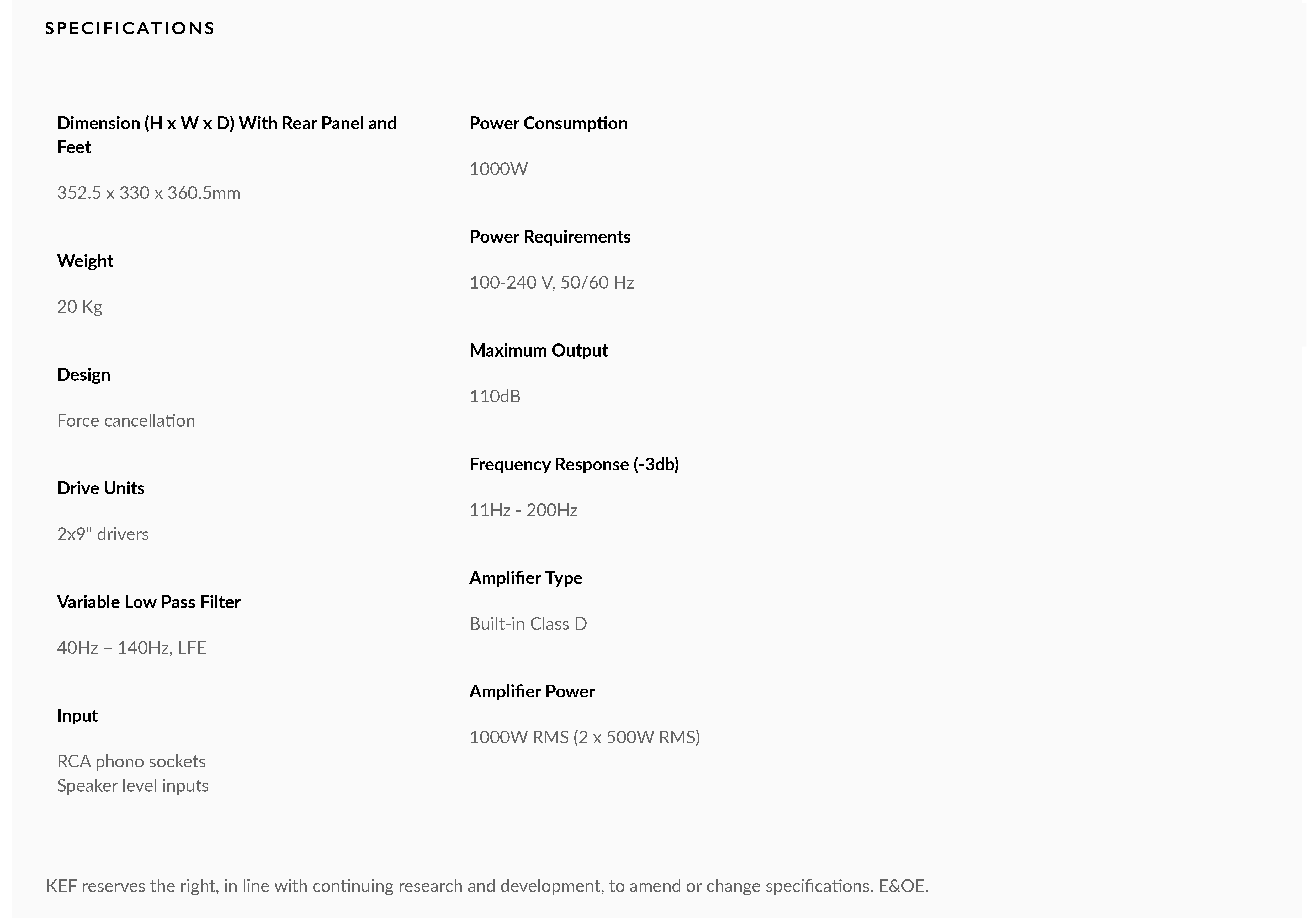 KF92 is a compact, room-friendly subwoofer engineered to deepen every listening experience. Two massive 9-inch drivers in a force-cancelling configuration are powered by an immense 1000 Watts (RMS) of power. Optimised with KEF's Music Integrity Engine
