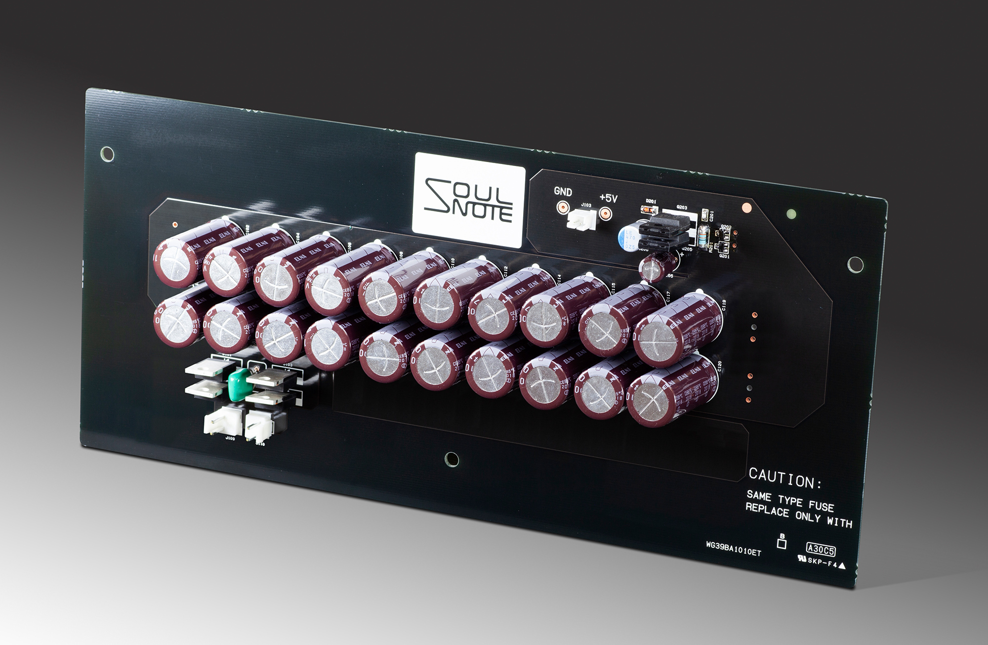 A high-capacity 200 VA toroidal transformer normally used in 100 W power amps provides an abundant power supply to drive the crystal oscillator. The rectifier diode relies on newly adopted ultra high-speed SiC diodes. The rectifier group is composed of numerous low-magnification, small-capacity electrolytic condensers connected in parallel, while the regulator incorporates Soulnote's unique non-NFB discrete power supply.