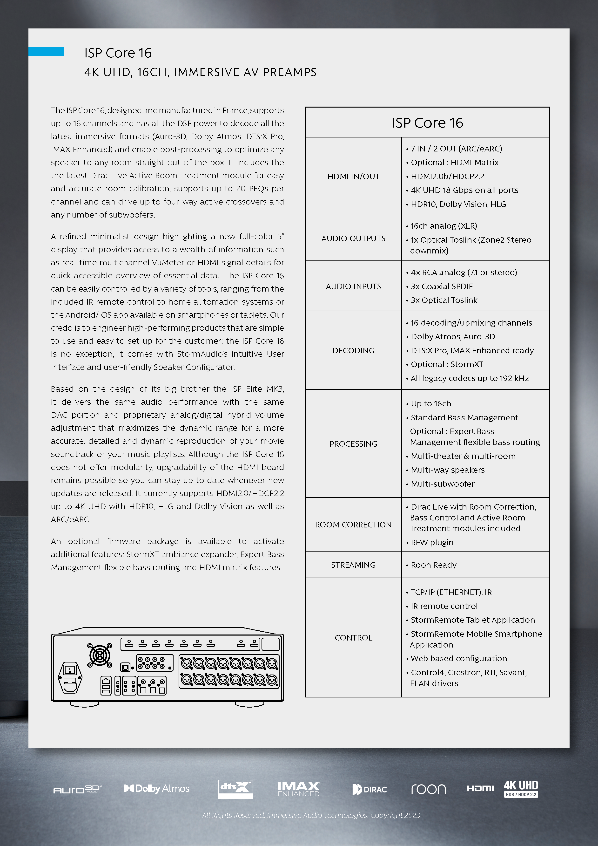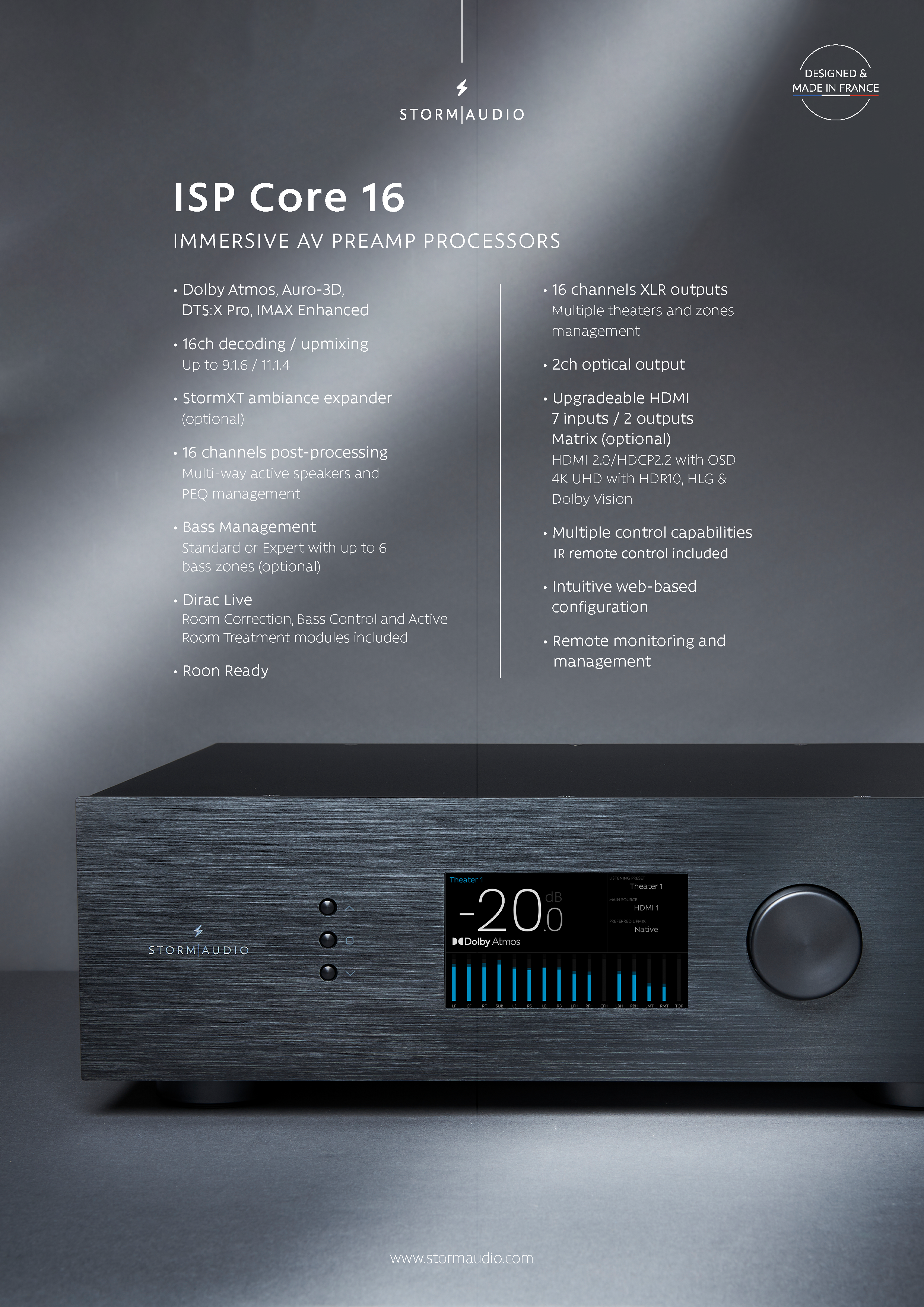 With a design based on the StormAudio ISP Elite platform, the ISP Core 16 is a sleek, compact and premium option that delivers StormAudio's signature functionality and performance in a 3U chassis.