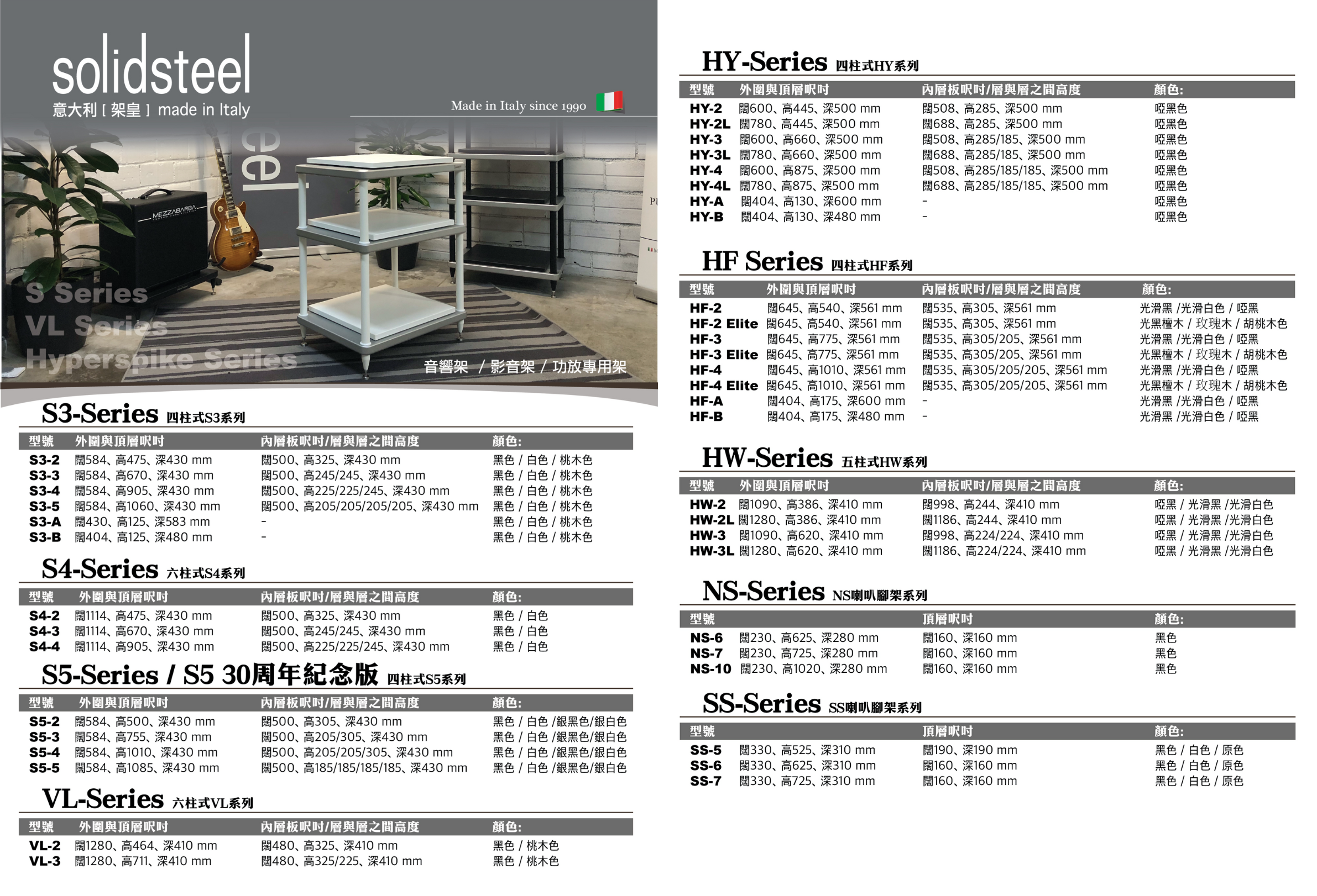 The S3 Series draws inspiration from decades of production results achieved by the historical Series 3, 5 and 6. The technical experience gained through the study and the development of individual models marked the history of the brand Solidsteel from more of twenty years. Thanks to the priority given on the quality research for the materials used, all the main characteristics of the previous technical products - made by welding - merge with the technical properties developed over the years from the Hyperspike line and gives life to a range of equipments mainly characterized by the excellence, the quality and the simplicity of its components. The refined and basilar style of the discontinued Series is unmistakably present in the new S3 Series, which is always the result of a passion for listening, for the audiophile and, above all, for music. In particular, the use of structural materials finely processed - carefully selected and of absolute Italian origin - allows the realization of a variety of supports with excellent functional properties, able to meet any type of need, both for a common Hi-Fi system that for a more complex setting. This line marks ultimately an important evolution within our product range thanks to its technical properties and offers to the listeners, like never before for what may concern our old welded products, as well an aesthetic improvement for this category of racks and bases, able in this way to be a point of reference for a wide variety of spaces and locations.