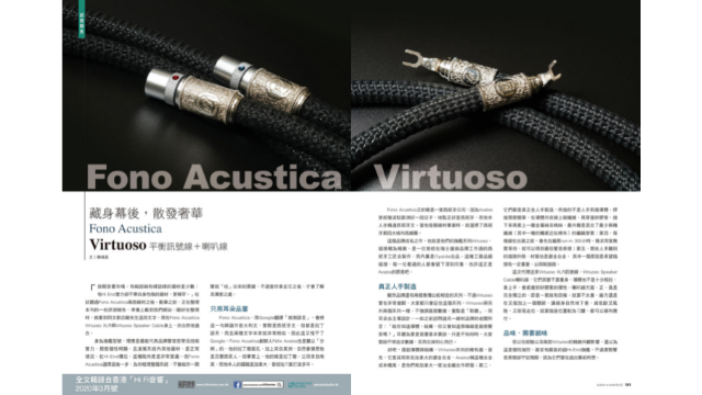 身為旗艦線的 Virtuoso,幾乎就是一個匯集 Fono Acustica 頂級技術之精華所在。導體同樣延續自家混合式金屬的風格,但用料卻大幅進化成目前堪稱音響用線最頂級的金銀合金,線身為單純的單芯結構,原廠從一間專接珠寶商訂單的加拿大金屬加工廠,購回材料後於自家的工廠進行導體製作,並以傳統且耗工的人工方式,將芯線根據特定的粗細與長度,製成最後的成品,為 Virtuoso 提供一流的訊號傳遞品質。而在線材的絕緣處理方面,此線也用上特別加厚的鐵氟龍作為絕緣材料,並將核心的導體配置線身內部所使用的空氣管,透過空氣最到最佳的絕緣層。