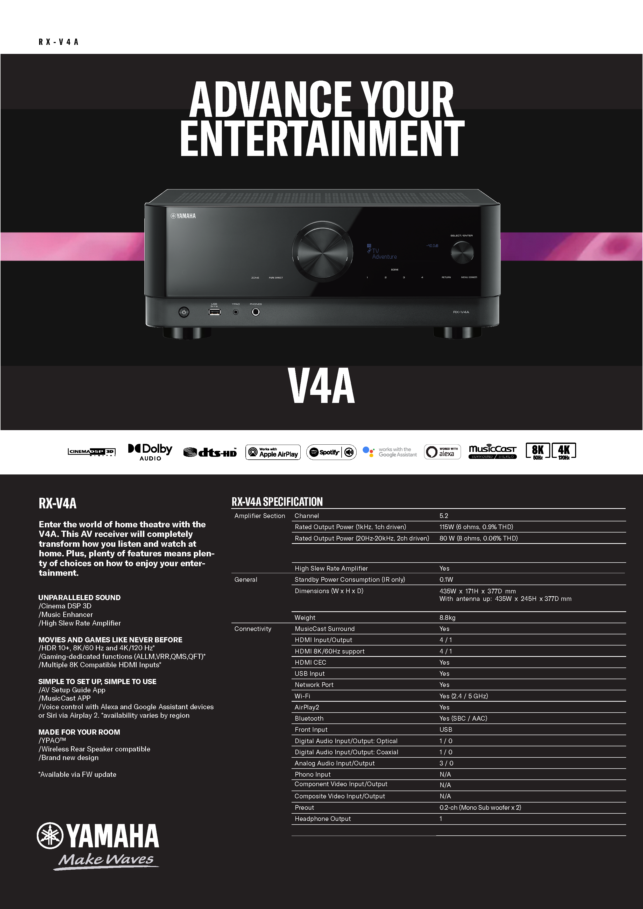 Wi-Fi、Bluetooth®,、AirPlay 2、Spotify 串流服務與 MusicCast多房間音響技術