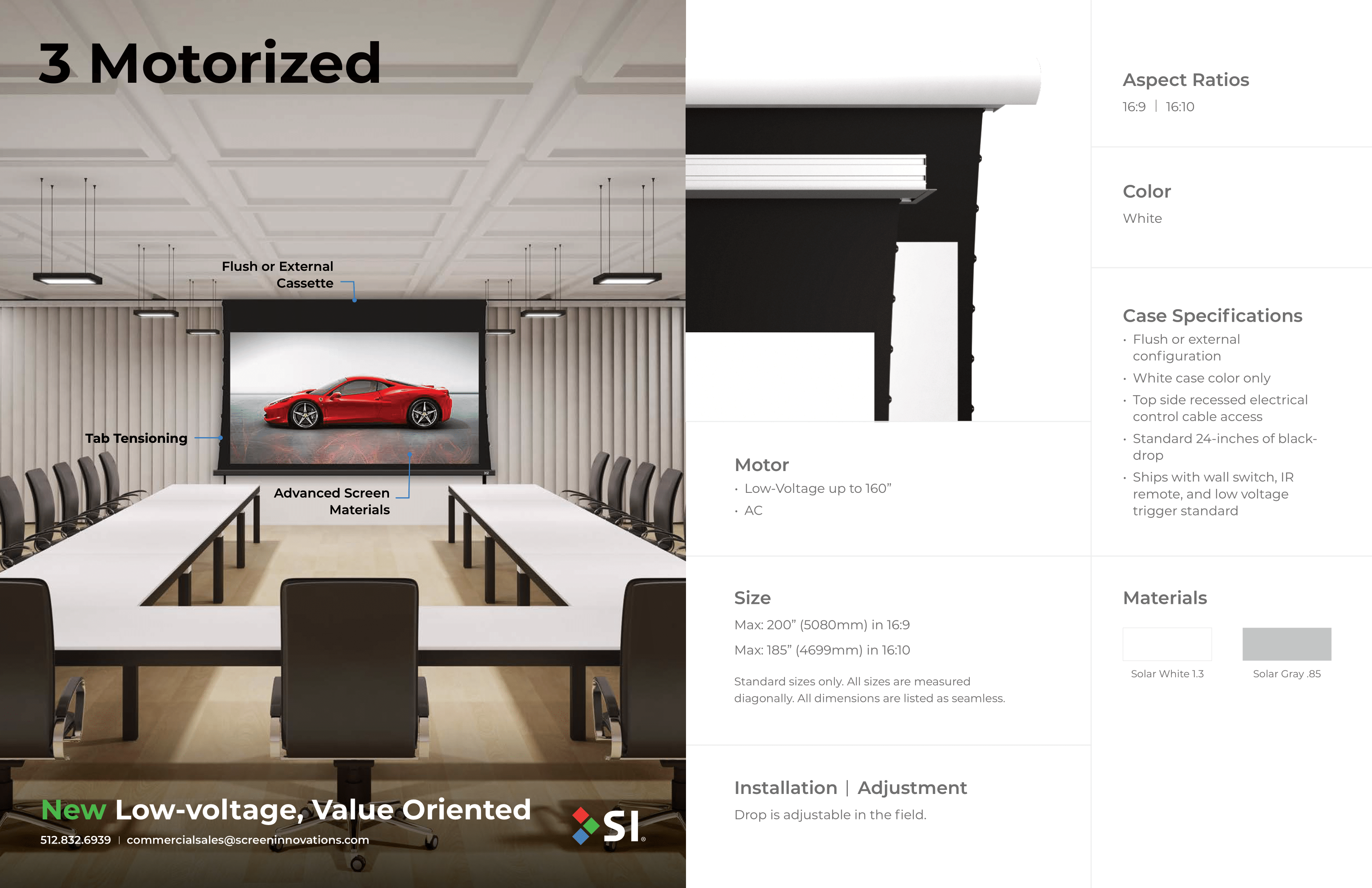 美國Screen Innovation 3系電動投影幕,合理價錢進階之選,適合安裝到天花結構內或牆身使用,備有不同增益度,透聲,前或後投射等物料選擇。