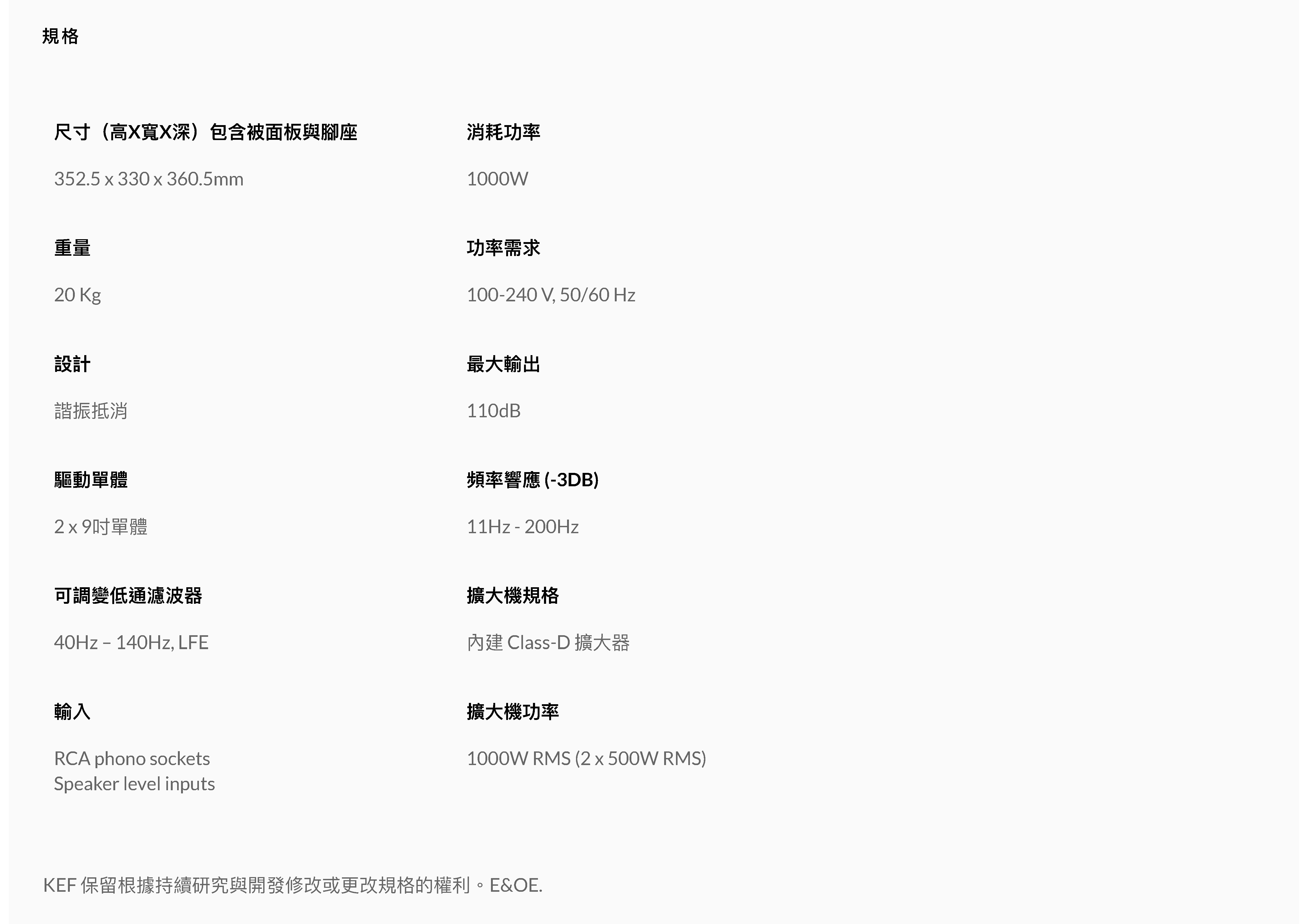 KF92超重低音揚聲器提供深沉明快的低頻威力,其體積精巧,可完美與空間搭配、結合。以 1000 W 強大功率推動備有諧振抵消配置的 9 吋雙驅動單體,再輔以 KEF Music Integrity Engine™ 進行最佳化處理,使 KF92 能展現極具深度的層次感、臨場感與聲音細節。